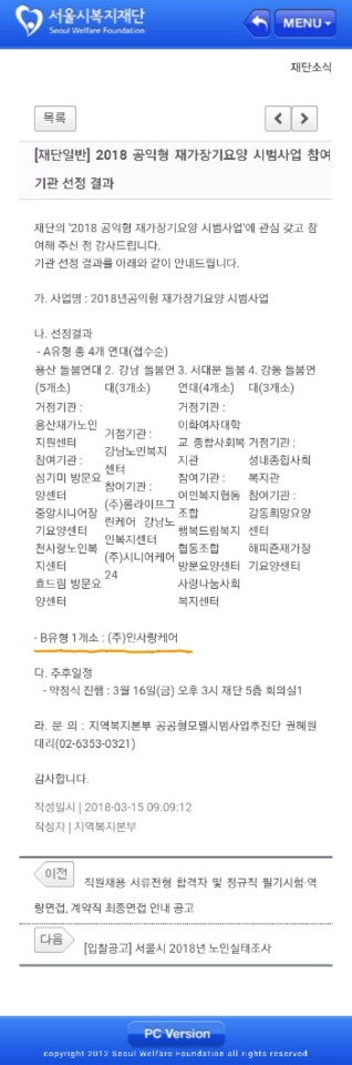 인사랑케어는 "2018년 공익형 재가장기요양 시범사업" 중 요양보호사 팀제(B유형) 운영 시범사업 기관으로 선정되었습니다.